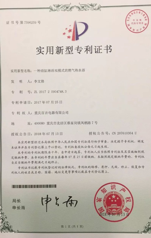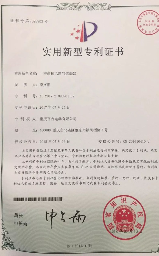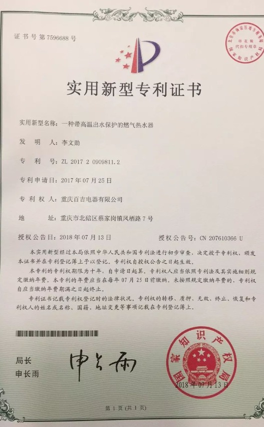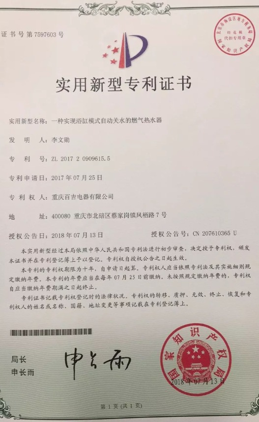 近日,百吉自主研發(fā)的多項技術(shù)通過了國家專利審查,喜獲授權(quán)!獲得專利的技術(shù)名稱分別是:一種高抗風燃氣燃燒器、一種帶高溫出水保護的燃氣熱水器、一種浴缸淋浴雙模式的燃氣熱水器以及一種實現(xiàn)浴缸模式自動關(guān)水的燃氣熱水器。